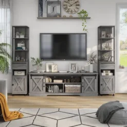 3pc Clander TV Stand And Bookcase Tower Set Vintage Gray Oak – HOMES: Inside + Out