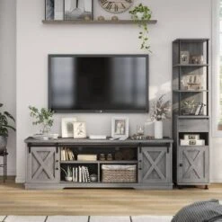 2pc Clander TV Stand And Bookcase Tower Set Vintage Gray Oak – HOMES: Inside + Out
