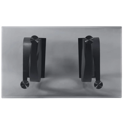 Suffuse your dining room with the modern elegance of this impressive, contemporary rectangular dining table. Two sculpted pedestals feature opposing C-shaped, wave-like forms in a champagne finish, creating a rich, dynamic visual presentation. The waves sit on glossy black platforms that add stability and stylish contrast. The tabletop is a gorgeous piece of smoky gray glass with a beveled edge that adds a classic finishing touch.