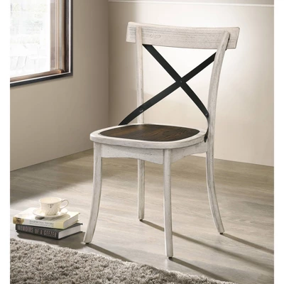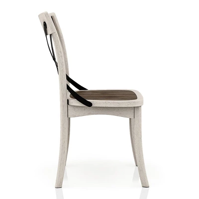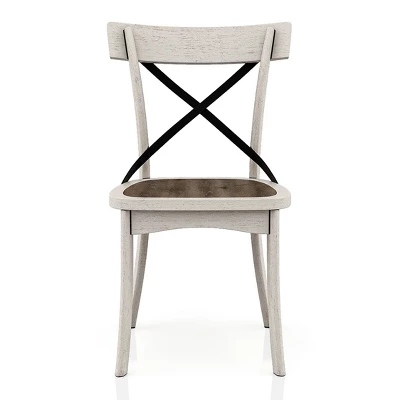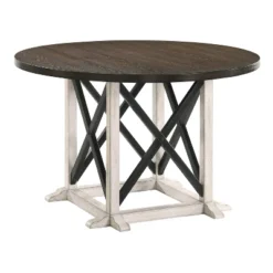 Modern farmhouse style is captured in this 5-piece dining set. The antique white frames contrast with the black and dark oak accents. A trestle base and X-back chairs are a country comfort design that welcomes conversation. This frame is made from recycled lumber, which had its begging’s on a rubber tree farm. To prevent the traditional waste of natural resources through burning, rubber trees are retired into furniture.