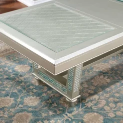 Introduce unparalleled glamour with this seven-piece rectangular dining table set in gold-tone. A stunning centerpiece for your dining room, the table boasts a shimmering champagne finish to complement solid wood and wood veneer construction. Textured details augment a clear tempered glass tabletop that creates a clean, smooth surface for delicious dinners. Chairs boast a contoured back with button tufting over warm gray faux leather for a lush look and feel.