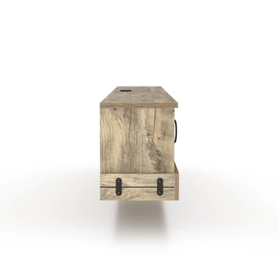 This industrial-inspired mountable TV console is perfect for a rustic or farmhouse-style living room. The black bolt brackets and bar pulls are combined with a touch of modern industrial design. A wire hole with grommet insert on top will guide wires from your entertainment center to keep an organized look.