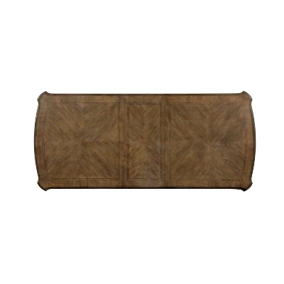 Bold grace and ornate beauty make for a refined focal point in this robust dining table. The chic trestle base is matched wonderfully with a distressed two-tone finish for utter warmth and rustic sophistication sure to enliven and enrich your home. The beveled edge of the wood tabletop is met with corner carvings and the bracketed base.