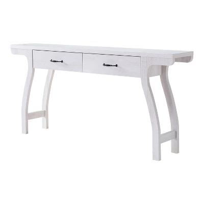 A transitional console table mingles into a hallway for a convenient stash-away place. Two spacious drawers on smooth metal glides offer space for keys and mail. With a curved silhouette, a gorgeous white oak finish, and classic black bar pulls, this hallway console makes quite the addition to your home.