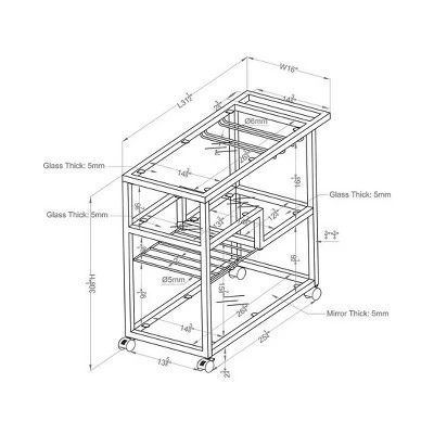 Host a wine and dine for close friends and impress with this chic glass serving cart. Three tempered glass shelves display hors d’oeuvres such a cheese, crackers, a bread basket, and fruits, while metal wine and stemware racks secure drinks. The bottom shelf is a mirror that reflects all the luster of this silver metal cart.