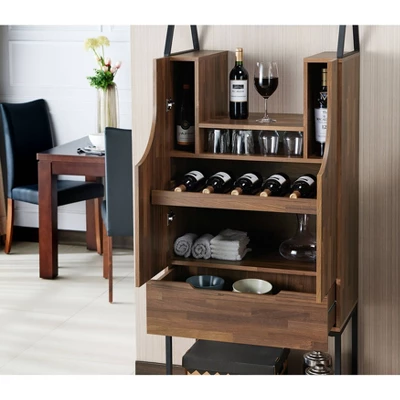 Give your home a charming modern industrial touch with this birdhouse inspired wine cabinet. A roof-shaped metal rack hangs glasses while a U-shaped cut-out offers a place to serve. The double-door cabinet houses a 5-slot bottle holder to keep wine protected. With plenty of convenience shelving and a drawer for wine essentials.