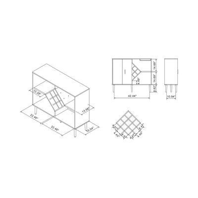 The contemporary Miko Black Wine Cabinet by Homes: Inside + Out offers a sleek server featuring sleek and smooth bifold cabinet doors and modern metallic accents. The eye catching diamond shape of the center wine rack of this buffet brings drama and geometric flair. The wine rack also delivers storage space for nine wine bottles showcasing your favorite vintages. Angled, tapered legs in a warm finish add a touch of mid-century flair sure to enliven your dining room.